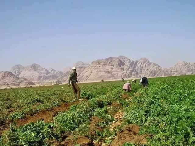 種植者從百米深的地下含水層中抽取水,利用噴嘴對圓形農(nóng)田進(jìn)行灌溉,這樣可以較大限度節(jié)省水源。這里種植的種類包括茄子、卷心菜、無花果、石榴、馬鈴薯、南瓜、西紅柿等多種蔬菜。農(nóng)場的技術(shù)相當(dāng)成功,使得目前該農(nóng)場生產(chǎn)著約旦大部分的糧食。