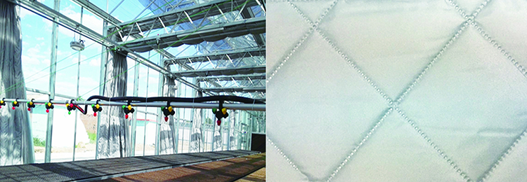 智能溫室內(nèi)保溫被簾采用兩層化纖面料經(jīng)單面涂銀處理,中間保溫層采用120克好質(zhì)量棉加工而成,成品重量為220克,幅寬4.3米,長度可定制。