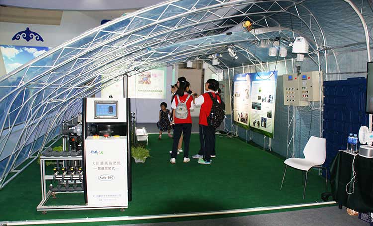 在展區(qū)中間,一座名為“新型裝配式內(nèi)保溫日光溫室&陽光畜牧棚舍”格外引人注目。這個(gè)外表是蔬菜暖棚的龐然大物,里面設(shè)置了LED智能顯示器、智能放風(fēng)和卷簾控制系統(tǒng)、營(yíng)養(yǎng)液施肥機(jī),還擺放著無土栽培綠色蔬菜樣品供觀眾觀賞。