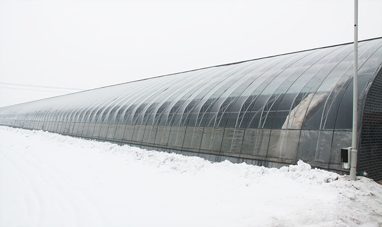 3、保溫性:雙膜單被,隔熱保溫好。晴天,外界-30℃下,棚內(nèi)溫度可以達到8℃以上。冬季不加溫可以進行果菜類生產(chǎn)。